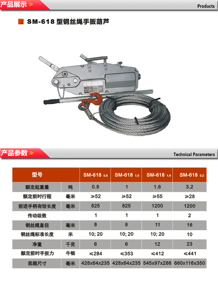 鋼絲繩手扳葫蘆適應(yīng)于局部空間受到限制的狹窄地帶操作使用。對于野外作業(yè),高空作業(yè),坑道SM-618型鋼絲繩手板葫蘆深井作業(yè)中和無機(jī)電供能場所進(jìn)行起重作業(yè)將顯示出特殊的優(yōu)越性。