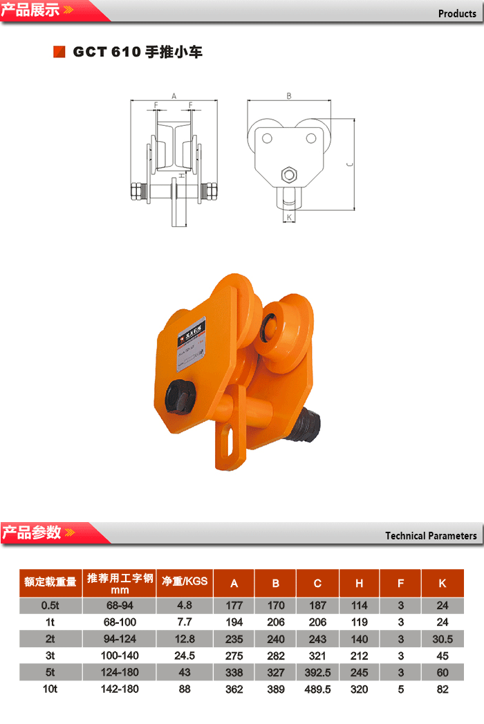 GCL/GCT810系列小車選用了全新的高強度低合金結構鋼,確保4倍安全載荷,輕巧、安全、安裝方便、是目前最為輕巧小車之一。